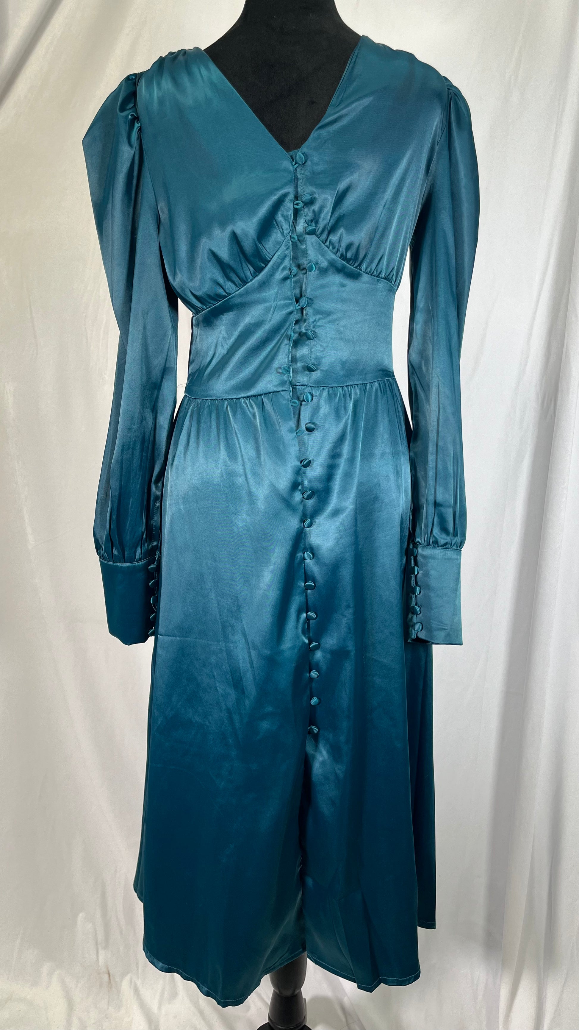 - Formal maxi dress with a chic, asymmetrical neckline. Made of light fabric, with a smooth and uniform structure. With a predominance of viscose. Elastic at the waist, emphasizing the waistline.Long Sleeve, loose cut at the height of the bust. The dress is characterized by femininity and uniqueness.