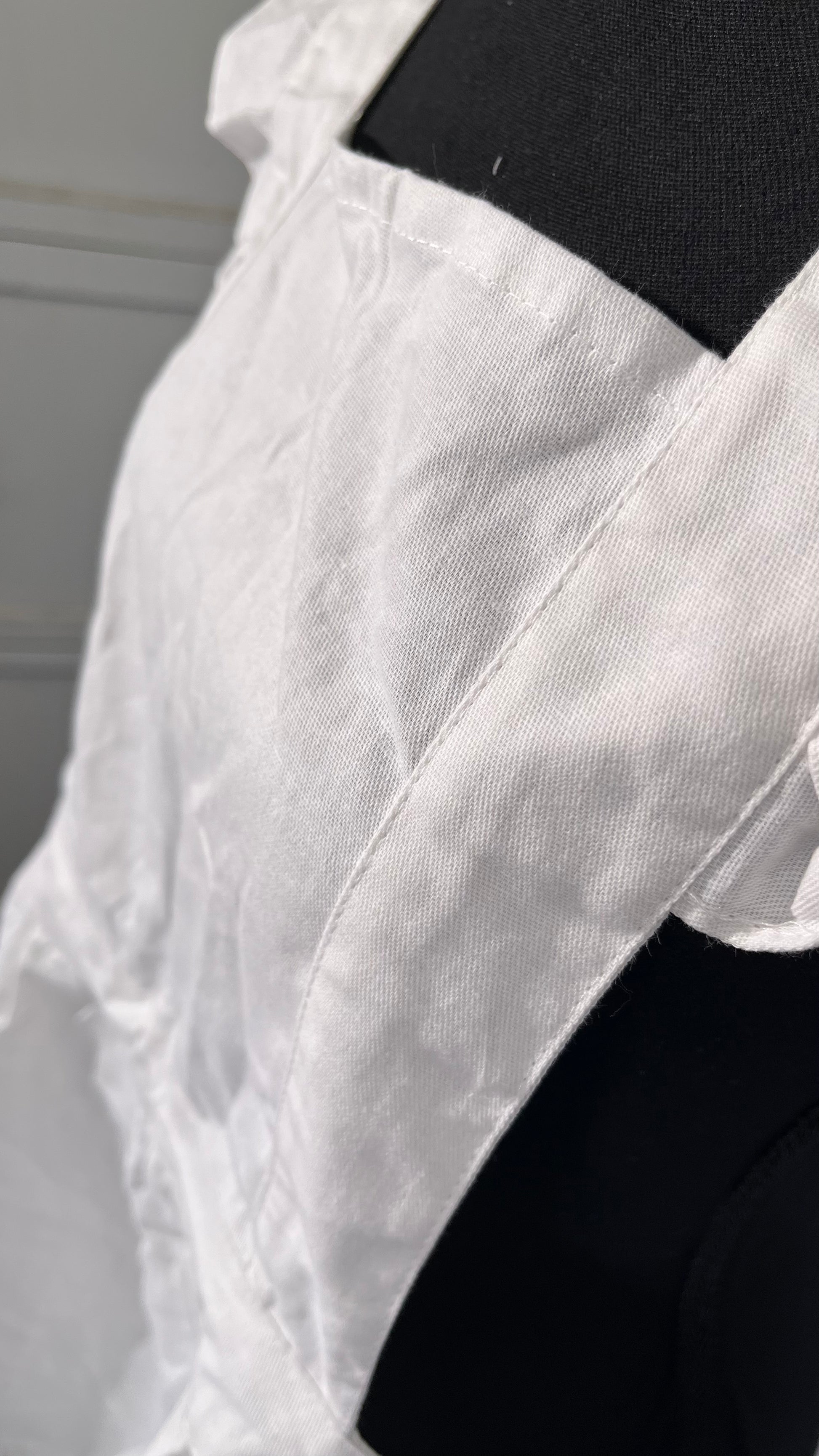 - DETAILS: This White Kitchen Apron has ruffles along the shoulder and bottom of the skirt