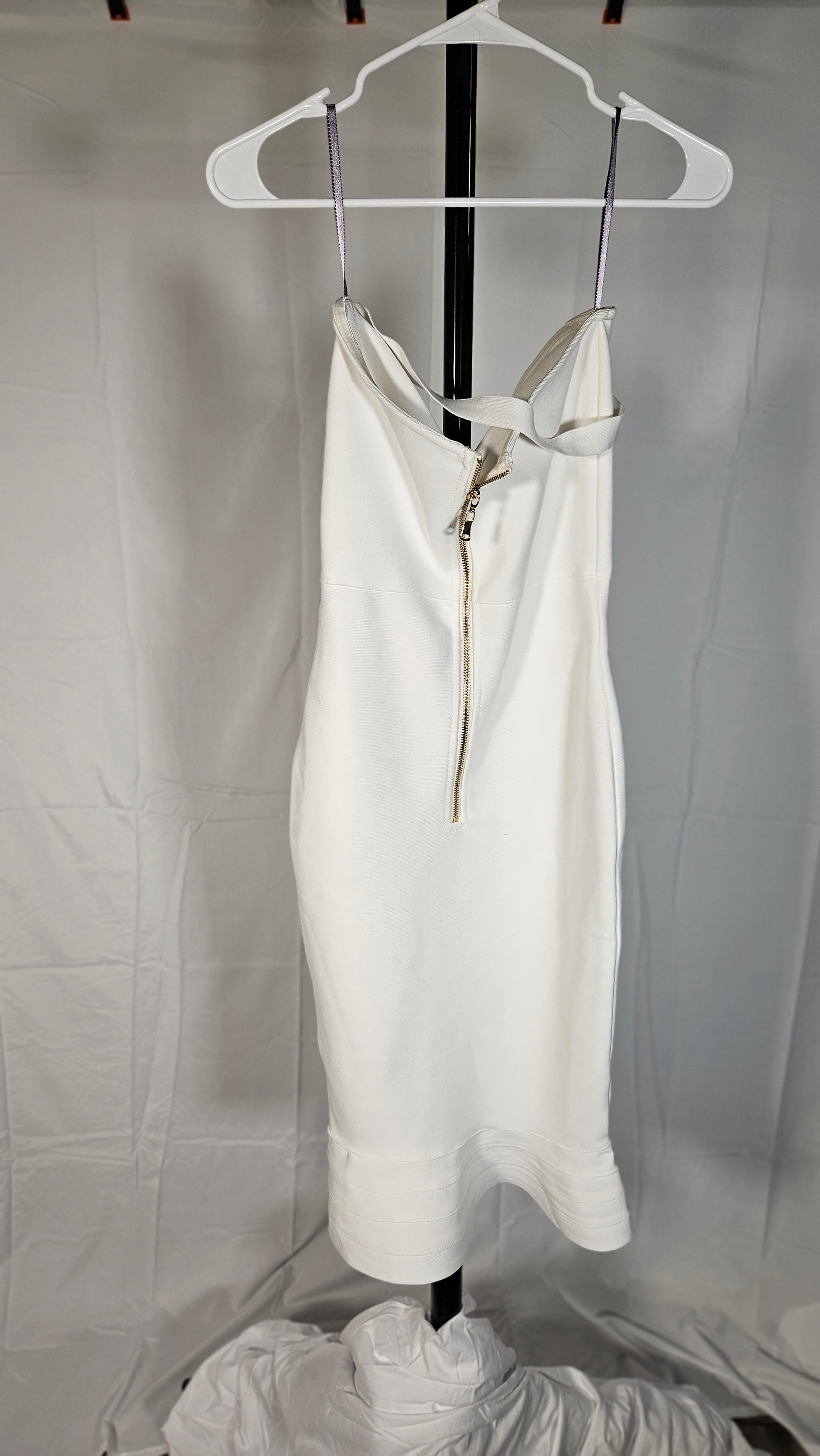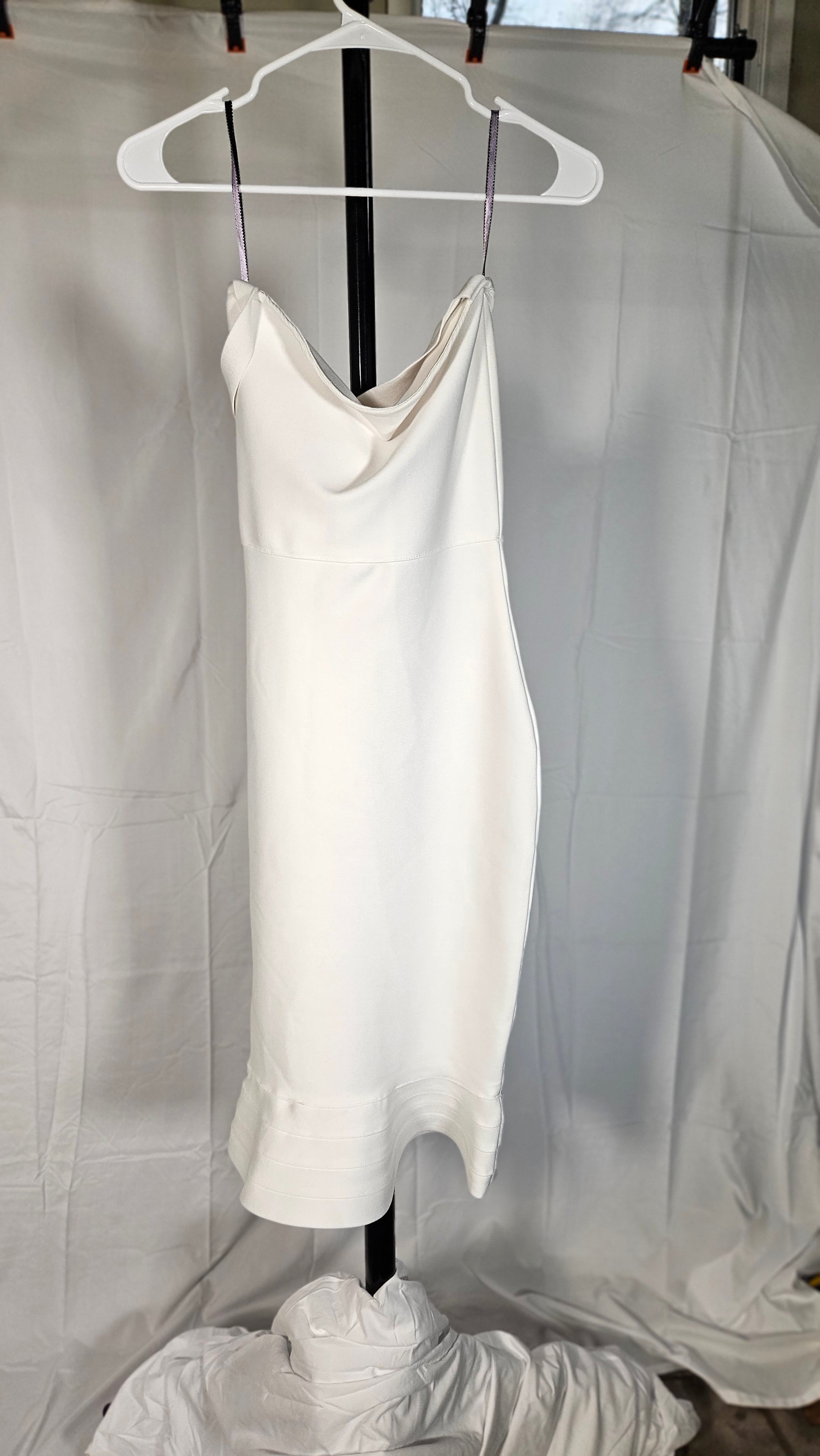 Midi dress with a V-neckline and thin adjustable straps. Elastic opening at the back. Invisible back zip fastening