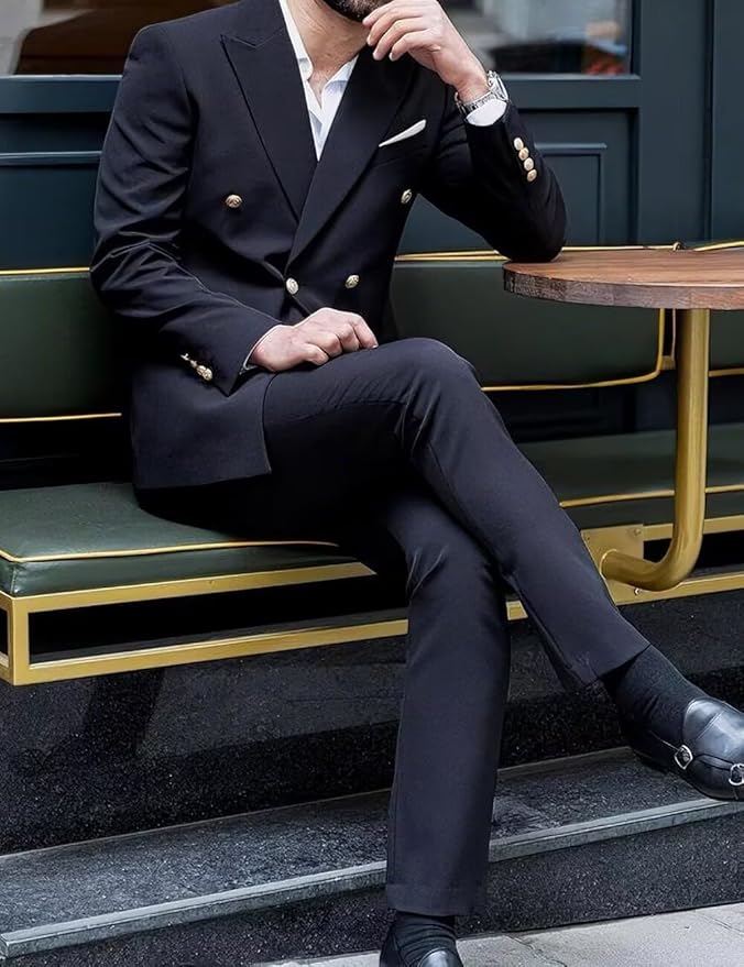 - Fabric: We use high quality polyester fabric, feel smooth, easy to clean. The classic 2-piece slim suit features an angled pocket design and gold buttons that differ from normal suits. Make it look stylish and sophisticated.
