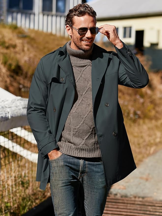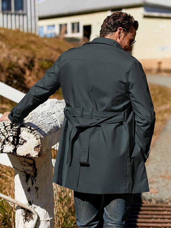 - 【Classic Fit】 Double-Breasted, Sleeve Tab, Waist Belt, Notched Lapel, Soft Lining, Length to Knee. Classic mid-length trench coat with great performance in windproof and thermal, Make you look attractive and stay you warm in the cold.