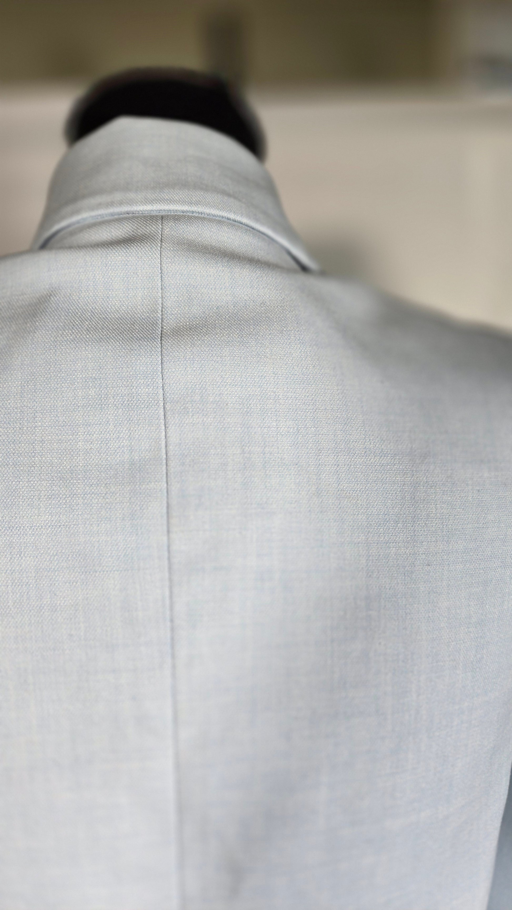 Blazer with lapel collar and long sleeves with shoulder pads. Front double breasted button closure.