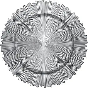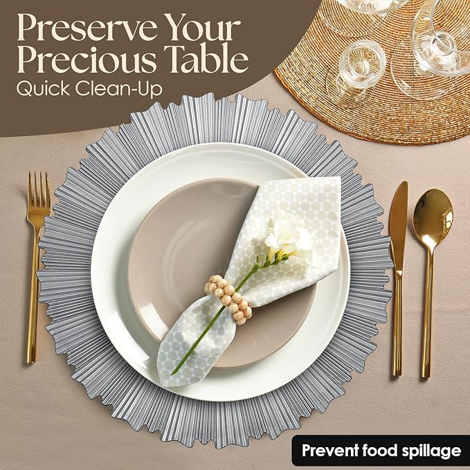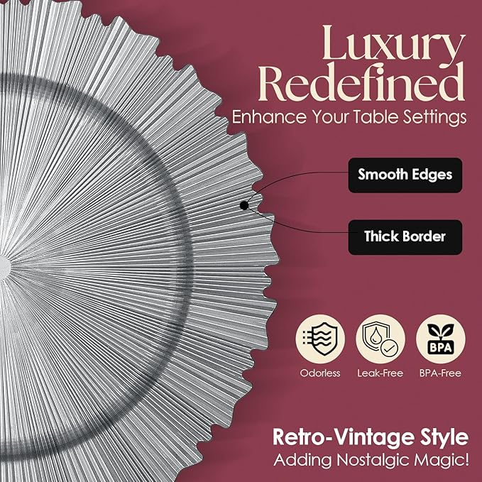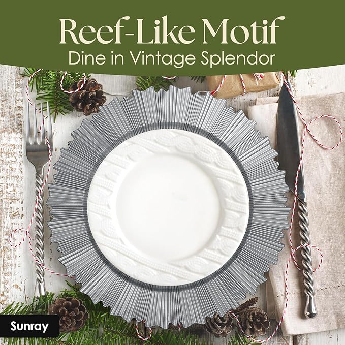 Silver Charger Plates Set - 13” Vintage Plastic Dinnerware Set - Reusable Elegant Serving Plates for Parties, Weddings and Events Set Of 6