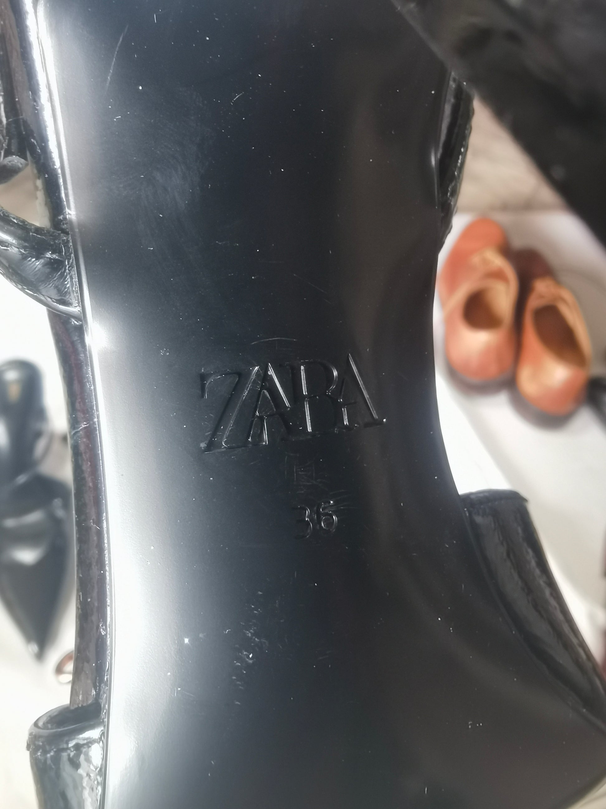 Patent finish slingback heels. Buckle back strap detail. Stiletto high heel. Double buckle ankle strap closure. Pointed toe.