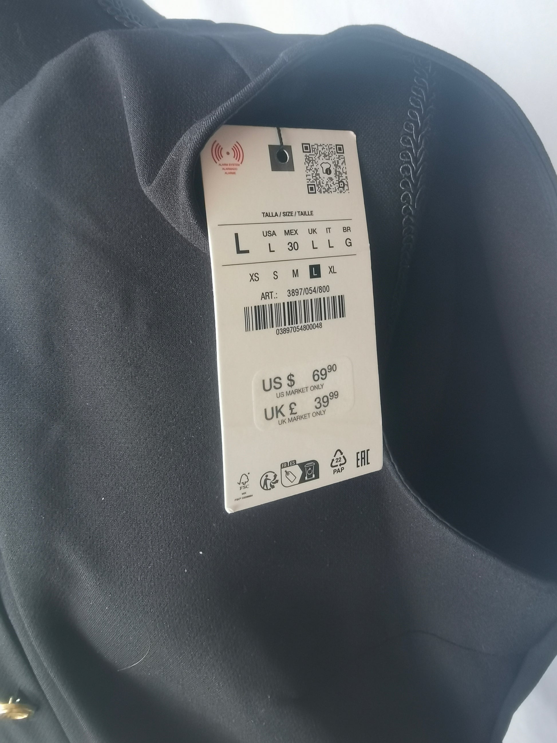 Sleeveless, round neck dress. Featuring mock buttons, an elasticated waistband with a gold appliqué, flap-front patch pockets, a front slit and a concealed zip fastening on the back.