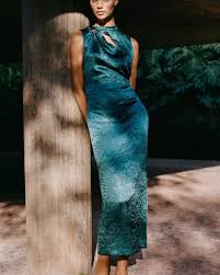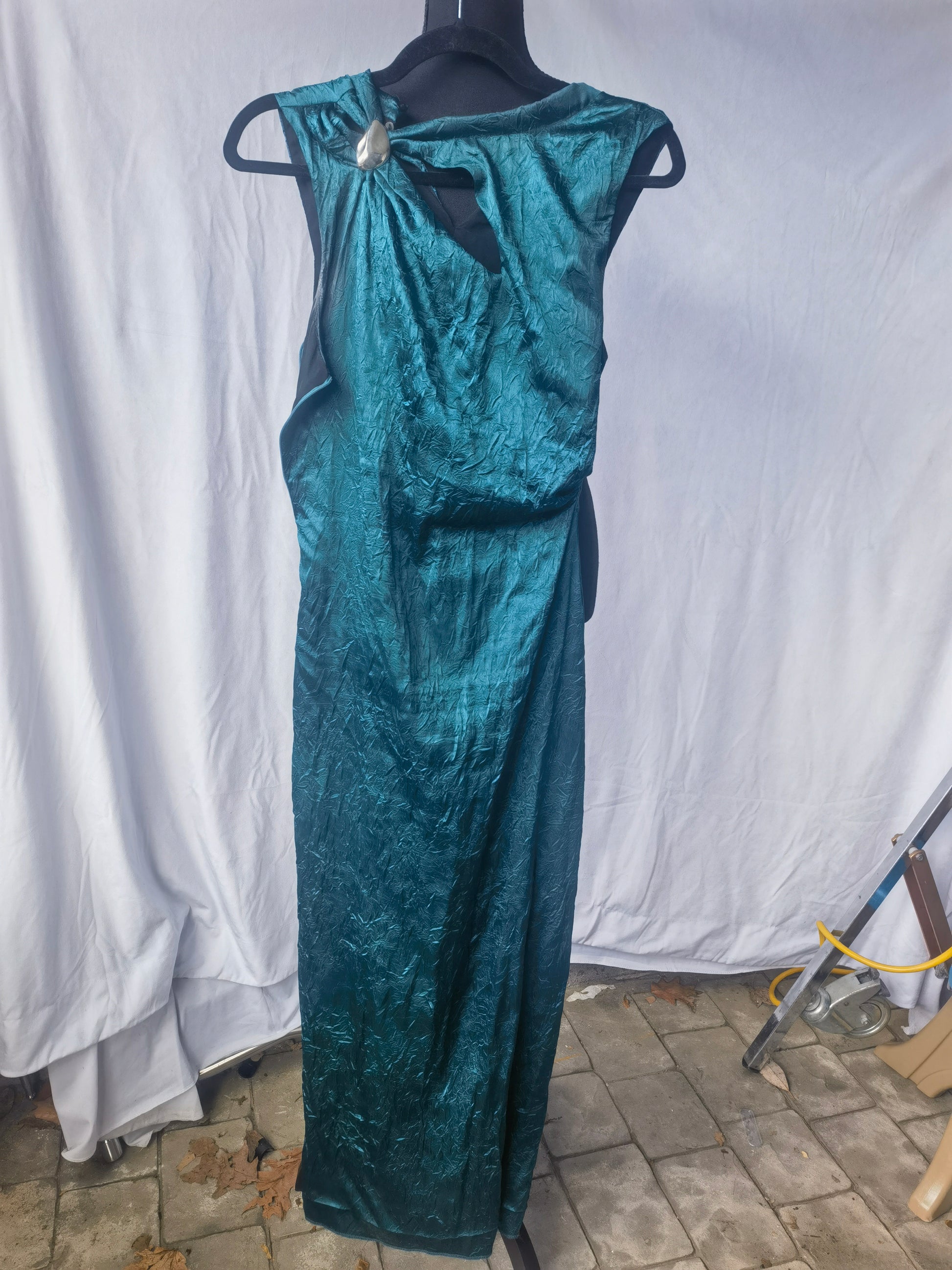 - Round neck sleeveless dress with gold appliqué. Pleats at side waist. Wrinkled satin effect fabric. Back slit at hem. Hidden in-seam side zip and back button closure.