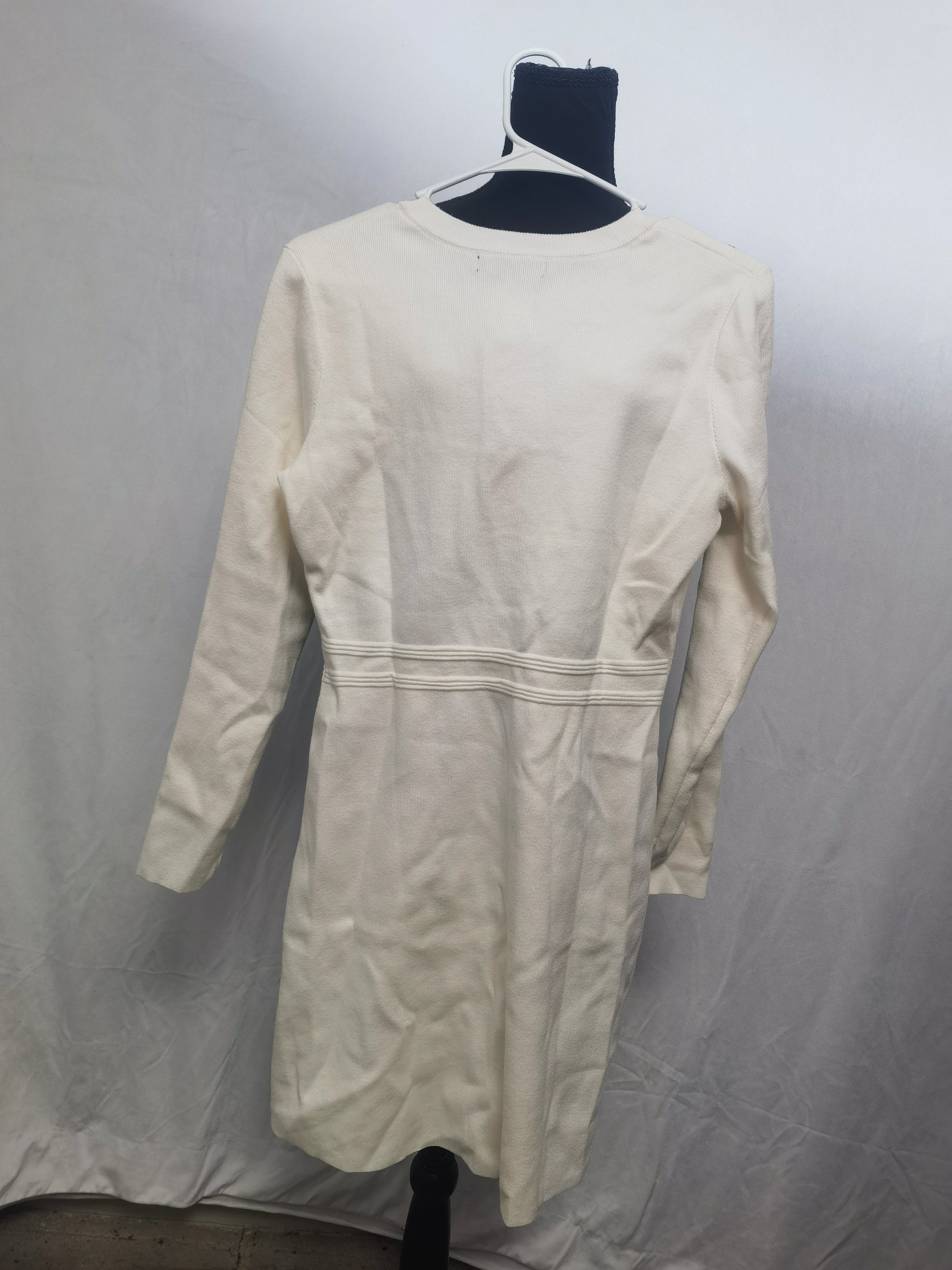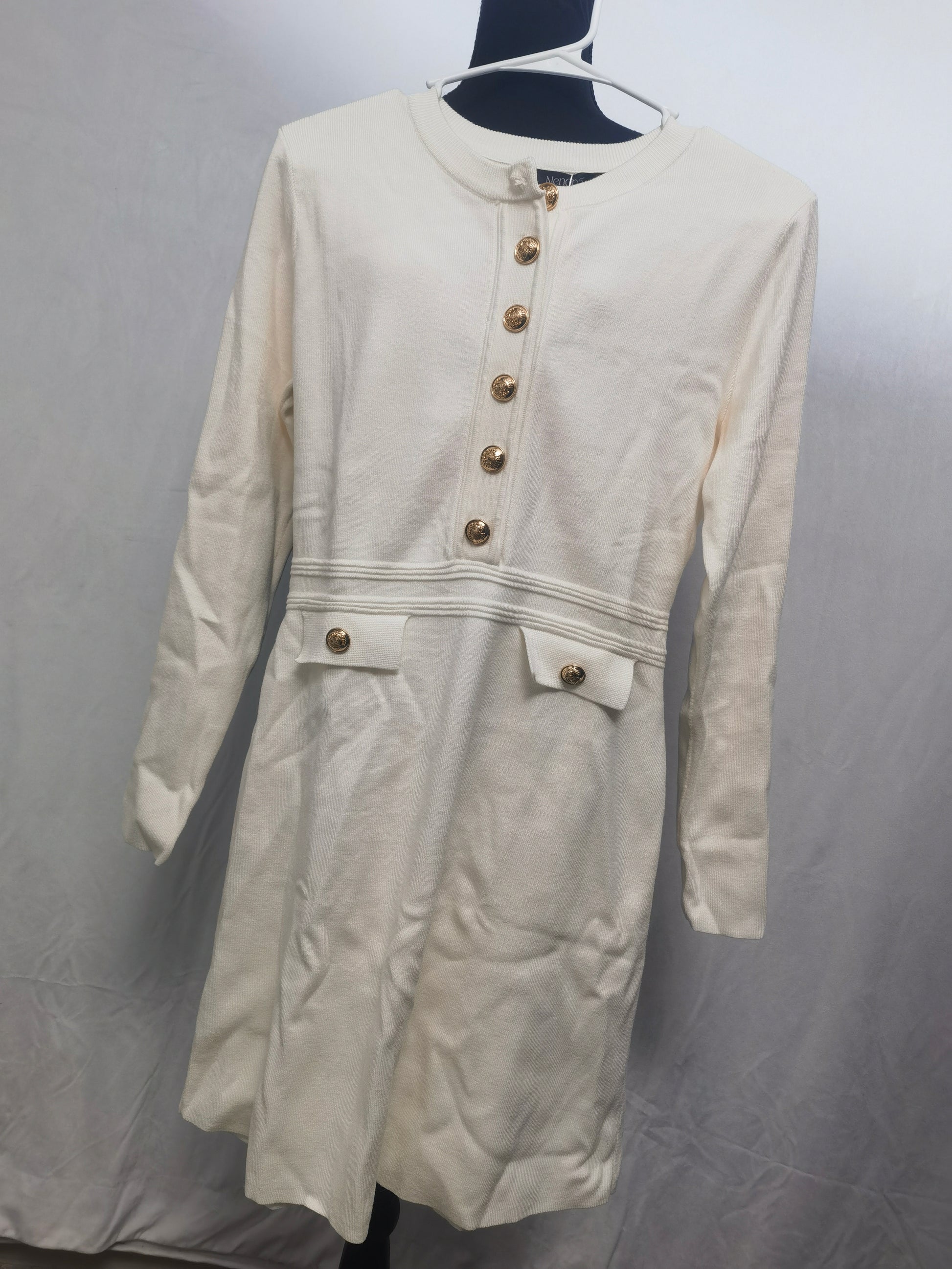 - Design: Long sleeve, round neckline, empire waist, gold-tone textured buttons, seamed waistband detail, a line mini skirt with two non-functional button flaps, nice as a business casual work dress