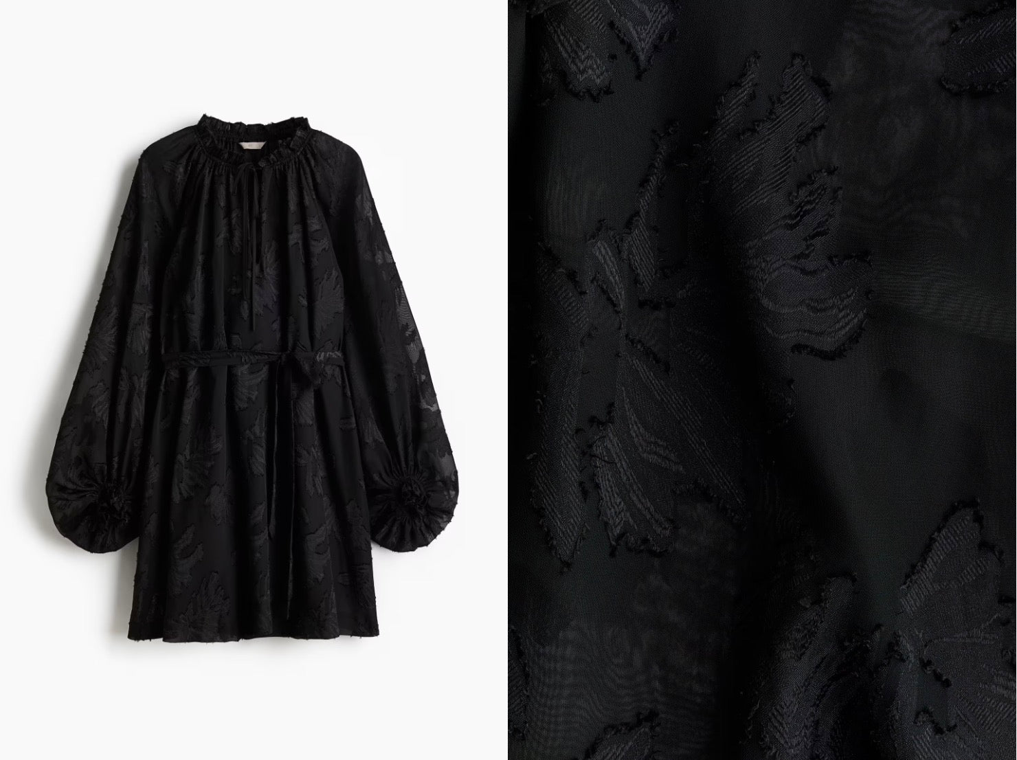 Short, loose-fit dress in jacquard-weave fabric. Ruffled neckline, V-shaped opening at front with extra-narrow ties, and removable tie belt at waist. Long raglan balloon sleeves with elasticized cuffs. V-neck liner dress with narrow shoulder straps.