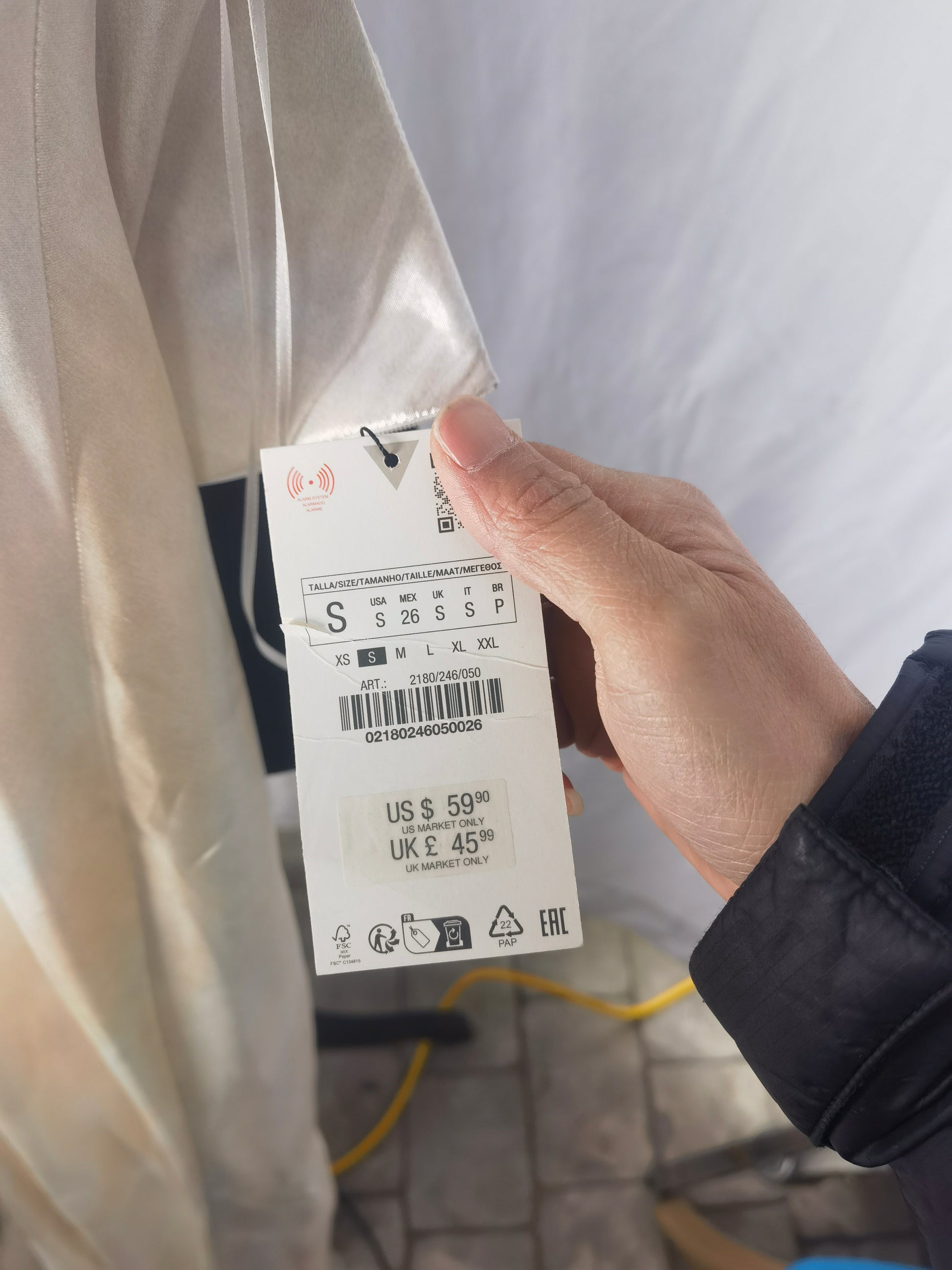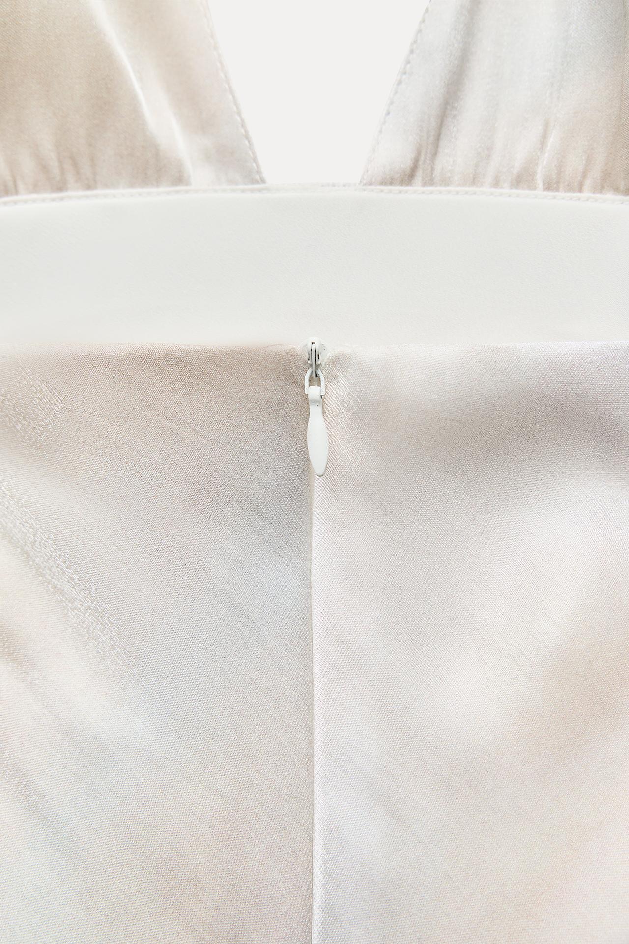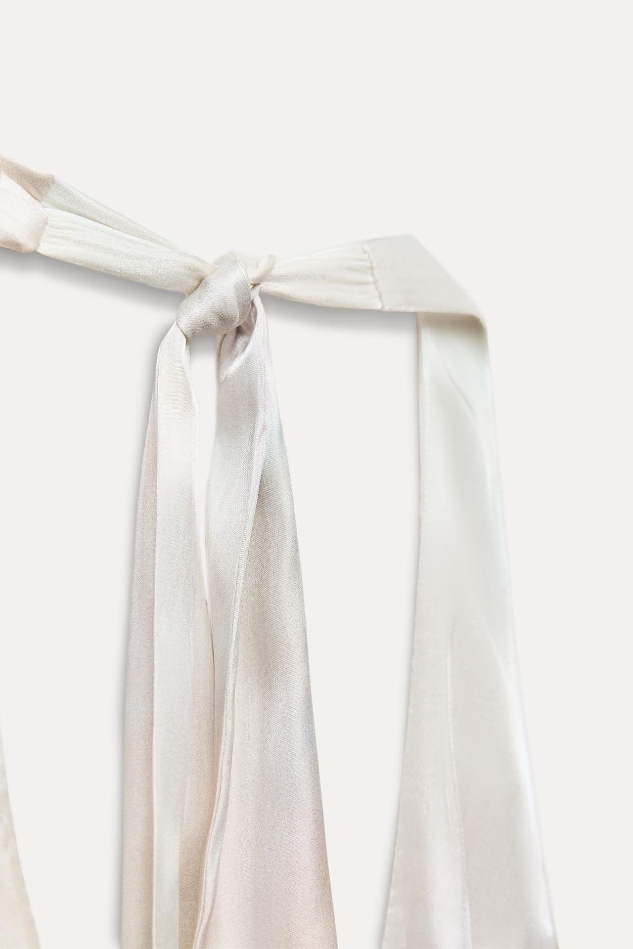 Full length dress with V-neckline and tied halter collar. Open back. Matching interior lining. Back hidden in-seam zip closure.