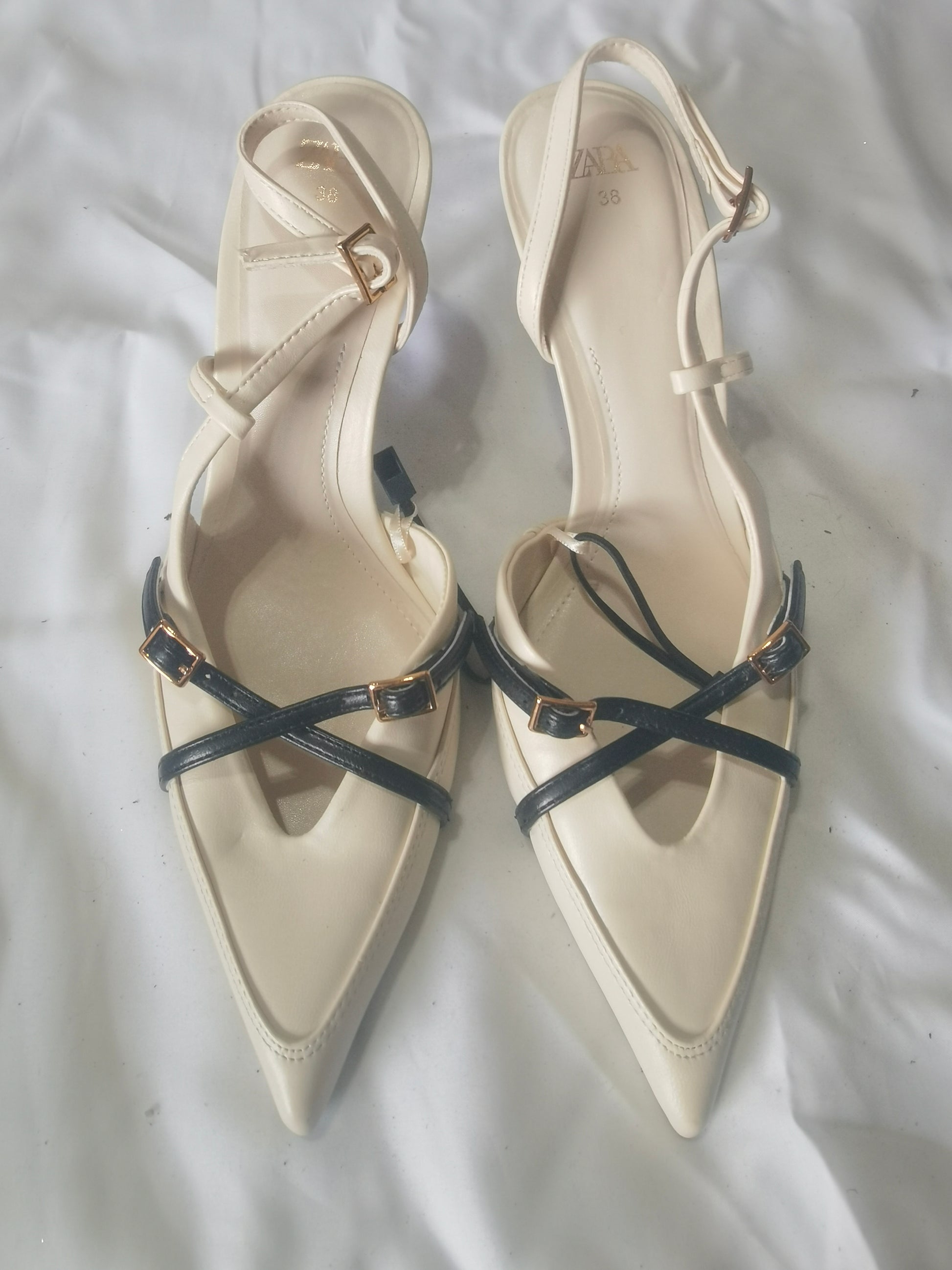Heeled shoe with front straps and buckle details. Thin heel. Adjustable buckle back strap. Pointed toe.