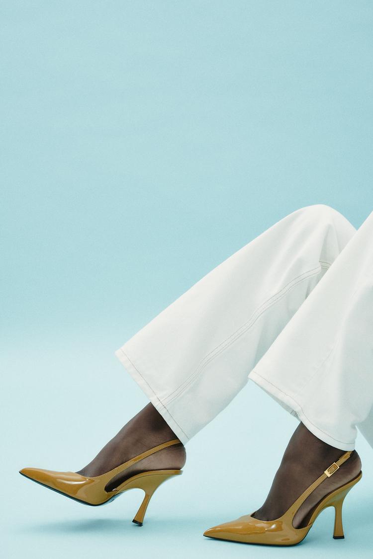 Patent slingback pumps. Topstitched detail on upper. Adjustable buckle closure on back strap. High stiletto heel. Pointed toe.