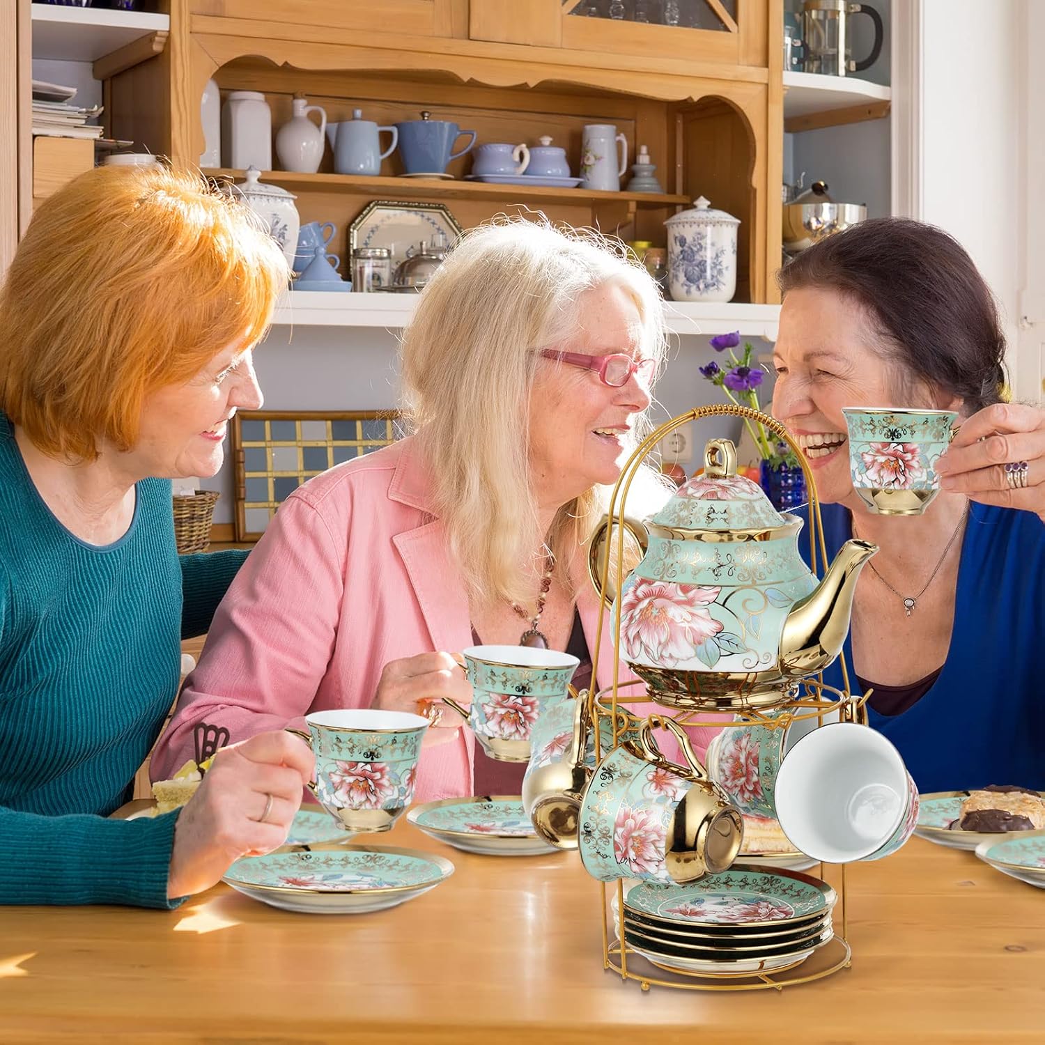 Zhehao 20 Pcs Porcelain Tea Set with Metal Holder and Spoon Adult Ceramic Tea Party Set European Flower Painting Teapot Cup Saucer Spoon Set for Women, Large Version(Fresh Style)